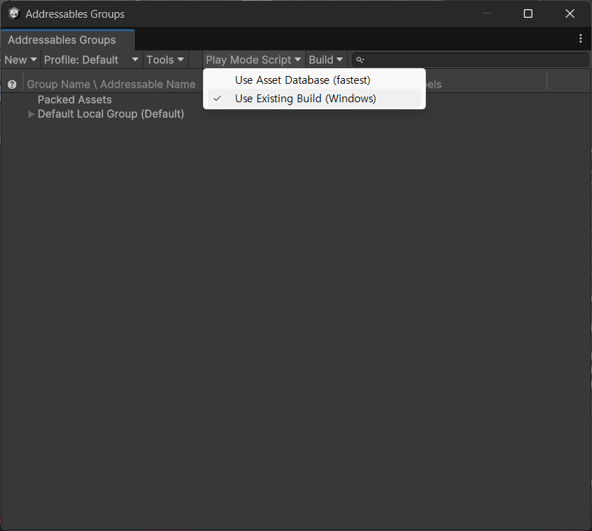 - Use Asset DataBase (fastest) : 이 옵션은 Addressable Asset을 로드할 때 Local DataBase를 사용하는 것으로 Editor 상에서 Address만 지정해 두었다면, 정상적으로 로드가 됩니다.