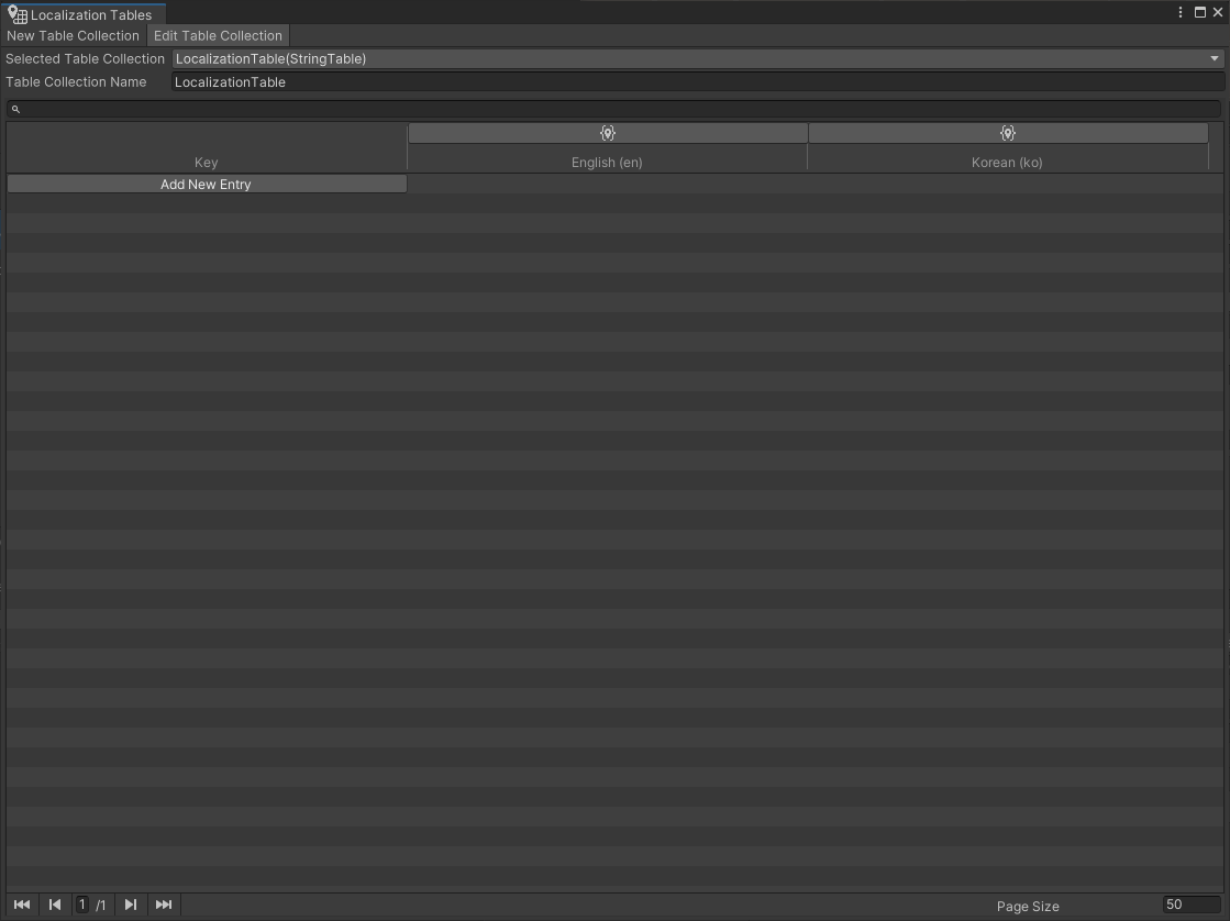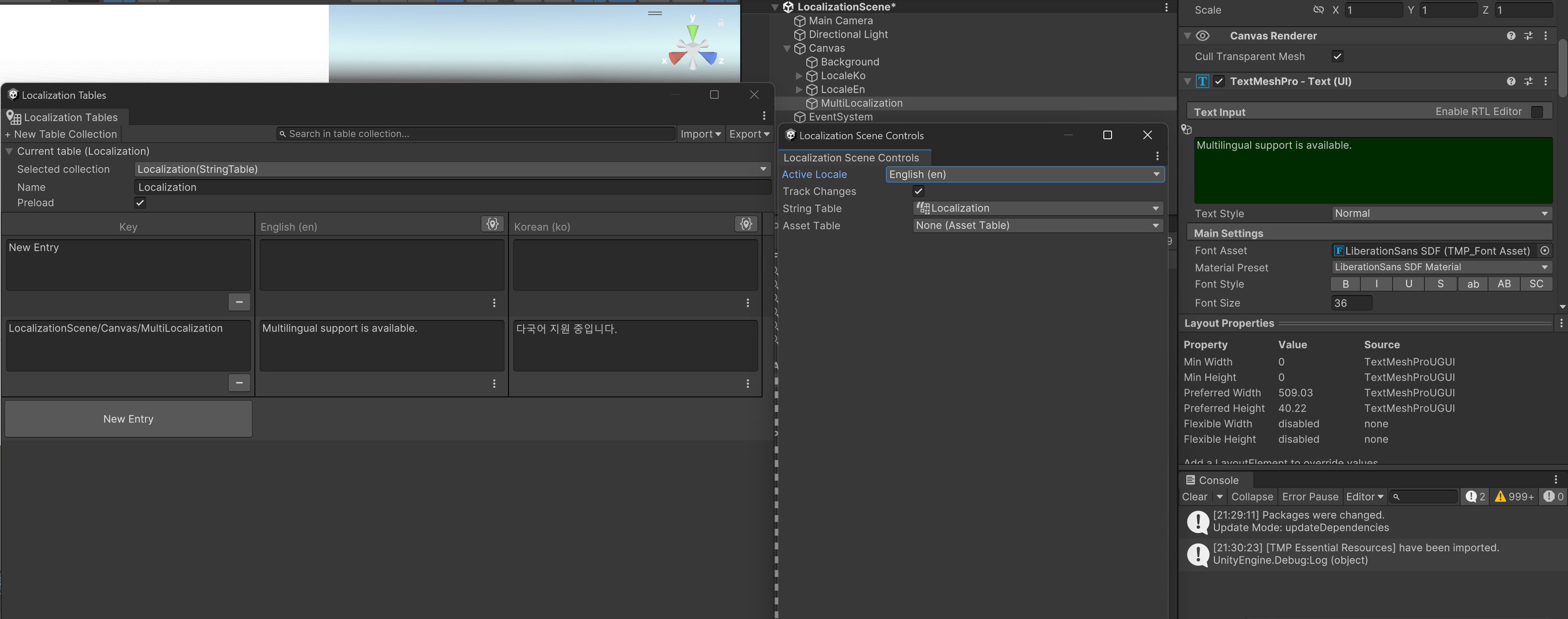 4. 이때 각 지원하는 언어를 Table에 지정해주면 Localization이 적용됩니다.