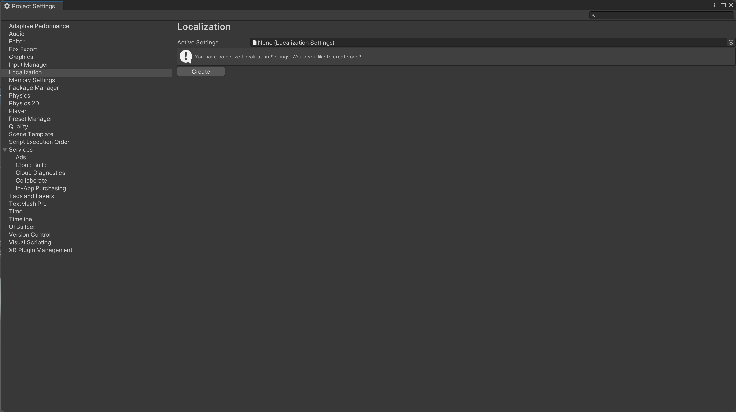 이제 빌드 세팅에서 Localization Settings를 생성해보겠습니다.