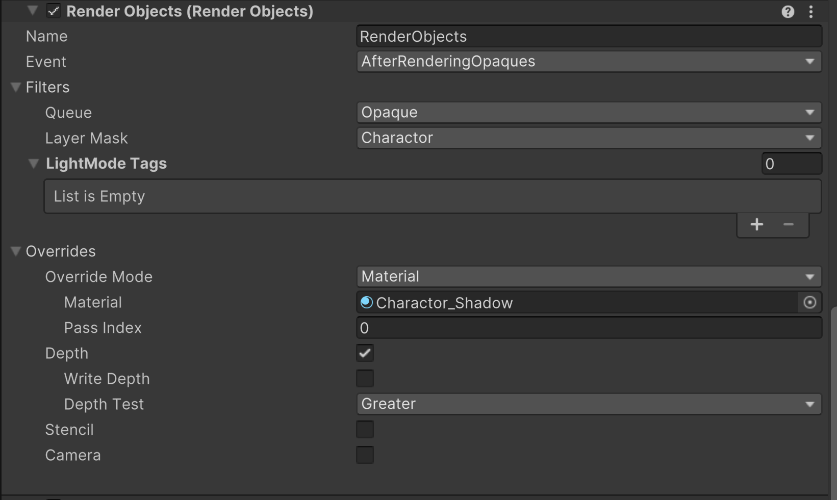- Render Objects 추가하여 Shadow 옵션을 적용한 이후에 Rendering을 해제한 오브젝트를 추가 렌더링을 진행합니다.