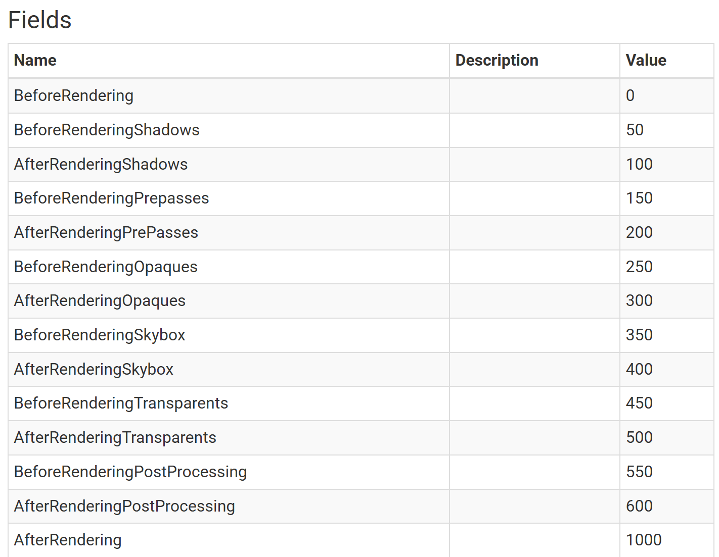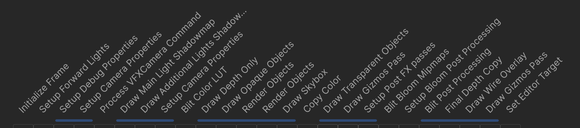 이때 Render Pass 란 TransparentObject, OpaqueObject, Shadow 등을 한 번에 렌더링 하는 것이 아닌 같은 타입의 그래픽스를 어떤 시점에 Command Buffer로 생성하여 GPU에 보내는 과정을 의미합니다. 아래와 같은 URP에서는 RenderPass Event를 가집니다.