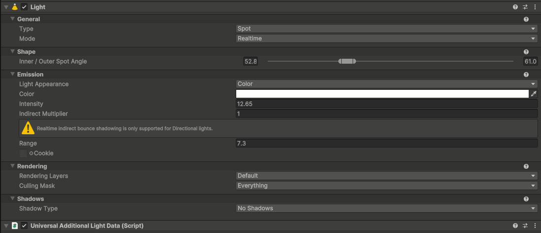 - Spot Light는 Directional Light와 비슷하게 방향성을 가지지만 Unity Scene 전체에 영향을 주는 것이 아닌 특정 지점에 빛을 형성합니다.