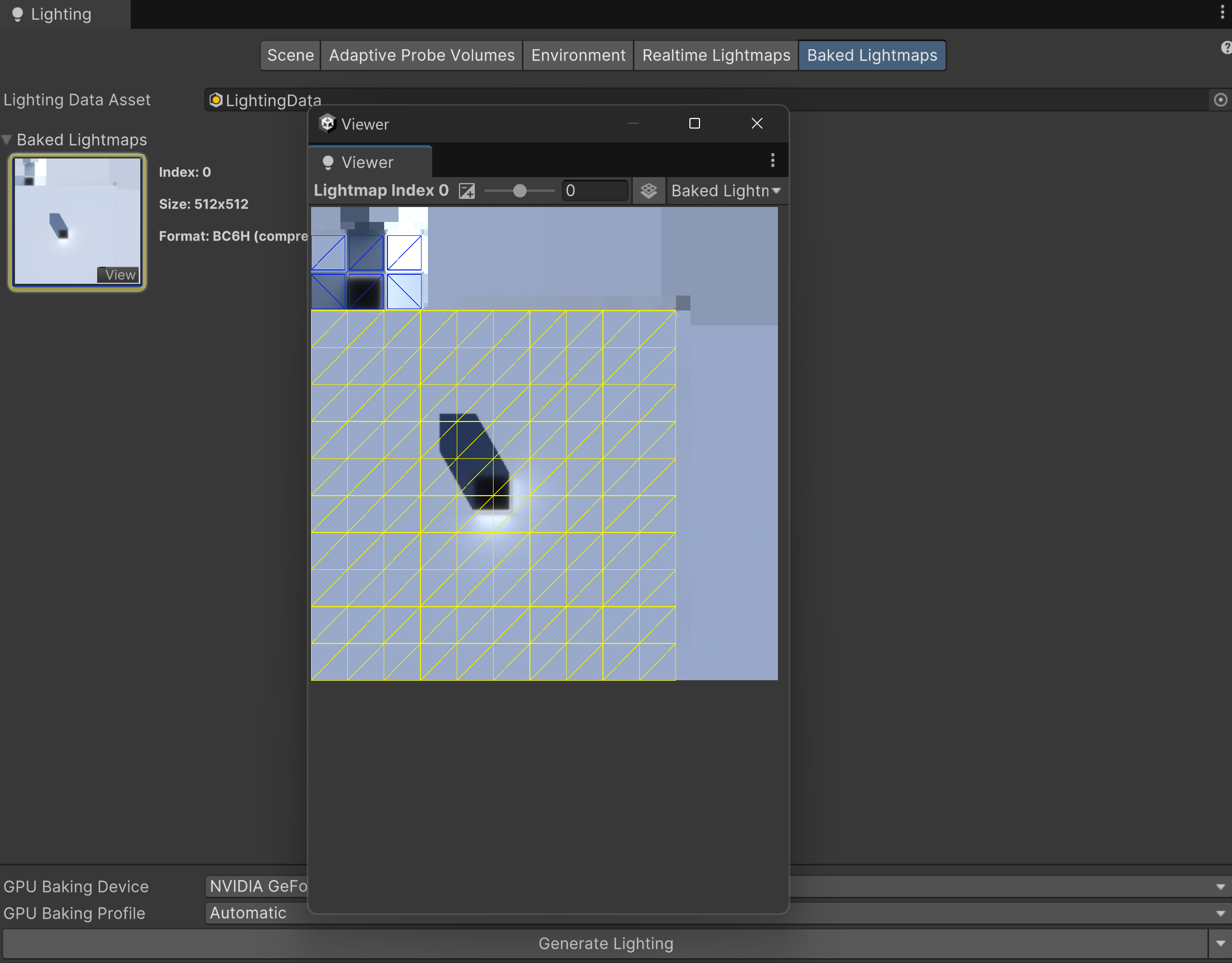 - 설정된 Lighting Setting을 최종 확인 후 Generate Lighting을 한다 이때GPU Baked Device를 지정, Baked Profile을 설정할 수있다.